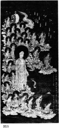 次に、十三世紀後半に属する例として、切幡寺、根津美術館、山口新六氏蔵、知恩院、遍明院の阿弥陀来迎図と、光明寺の「当麻曼荼羅縁起」中の阿弥陀来迎の場面(20)を取り上げる(21)。ここに挙げた例はすべて、二十五菩薩を阿弥陀如来の従者としている。この二十五菩薩は、『十往生阿弥陀仏国経(22)』に説かれる二十五菩薩〔現世で信仰者を擁護する〕の転用とみられている。つまりこれまで不定数であった阿弥陀の従者がここに来て一定数に固まる訳である。これは、奏楽する来迎菩薩の一般概念が確立する最初の段階と受けとめることができる。この段階を経て、やがて来迎二十五菩薩各々に固有の持物が規定されるようになるからである。他方、この二十五菩薩にはもはや、源信の説く七菩薩が含まれないことも注目される。合掌する一群が廃され、画面上でついに奏楽菩薩群が主体となったのである。