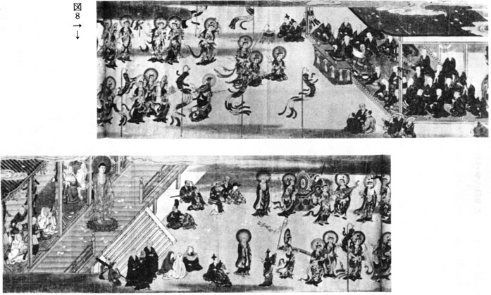 『観経』が伝えられた奈良時代には、その内容に忠実な絵画化が行なわれていた(観無量寿経変相図(8))。十一世紀半ばにして何故、こうした『観経』からの離脱が見い出されることになったのであろうか。この疑問を解決する為には、阿弥陀来迎図及び迎講の成立に最も深く関与した恵心僧都源信の思想について説明しなければならない。